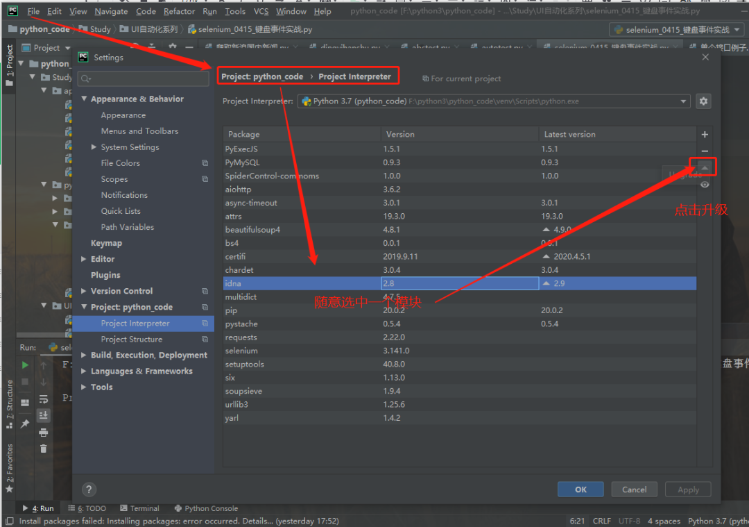 问题场景:在pycharm进行安装某些库,install失败,提示需要升级pip ,报错界面问题如下错误代码Non-zero exit code