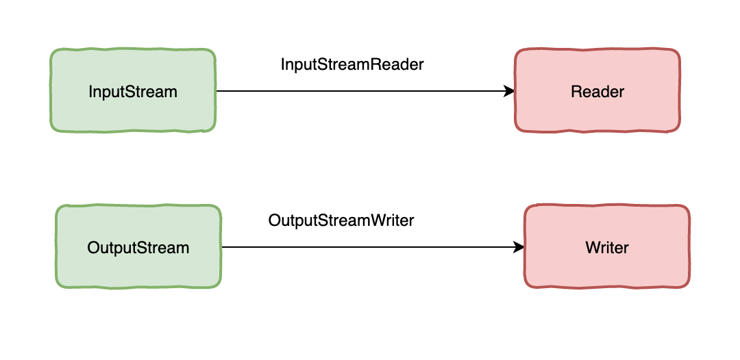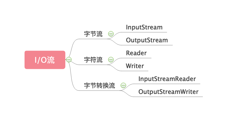 字节转换流分为两种,一种是把字节输入流转(InputStream)换化字符输入流(Reader),另一种是把字节输出流(OutputStram)转化为字符输出流(Writer),看完下面一张图你就明白了。