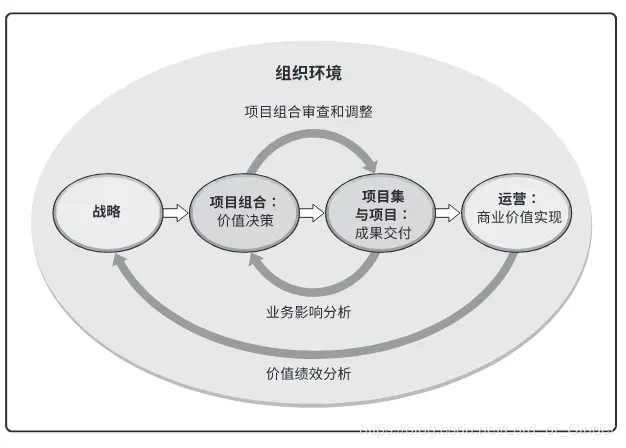 产品和运营会在产品生命周期的不同时间点交叉。 项目组合管理通过选择适当的项目集或项目,对工作进行优先排序,以及提供所需资源,来与组织战略保持一致。 项目集管理对其组成部分进行协调,对它们之间的依赖关系进行控制,从而实现既定收益。 项目管理使组织的目的和目标得以实现。
