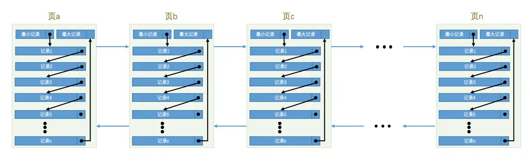 - 各个存放用户记录的页也是根据页中用户记录的主键大小顺序排成一个双向链表。(最后一层的用户数据层也是一个双向链表)