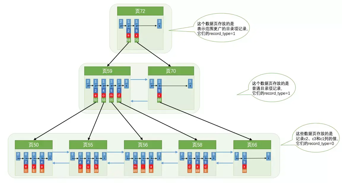 - InnoDB是使用页来作为管理存储空间的基本单位,也就是最多能保证16KB的连续存储空间,而随着表中记录数量的增多,需要非常大的连续的存储空间才能把所有的目录项都放下,这对记录数量非常多的表是不现实的。