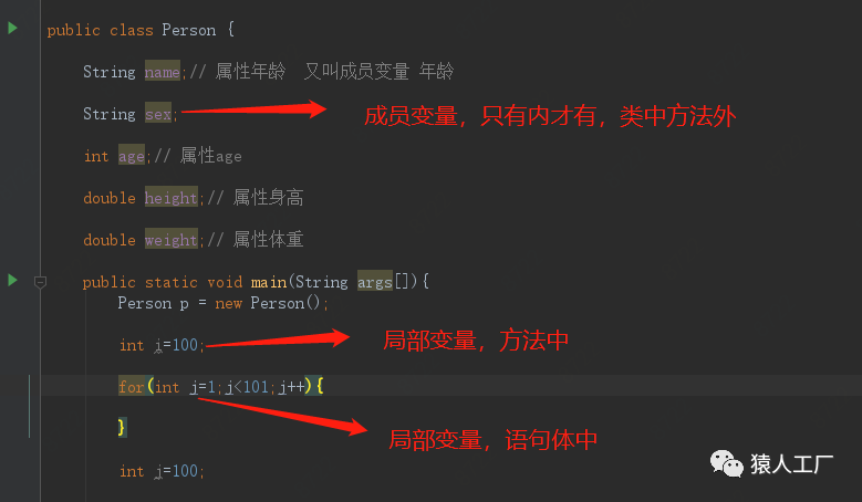 类的属性就是成员变量,方法中的变量,和语句体中的变量就是局部变量!他们的作用域是不同的,成员变量的作用域是整个类的范围,方法和语句体的变量作用域是在各自的语句体内,同一作用域,变量名是不允许重复的噢!