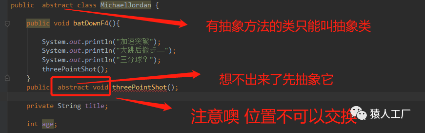 其实在现实生活中有很多抽象的概念。比如要打败球场4大怪,需要三分球,乔老爷子有自知之明,并不知道谁的三分球才可以打败他们。但是作为想要出门打篮球的你就必须想到用谁的三分球去打败4大怪。为了解决这种问题,java引入了抽象类和抽象方法。所谓抽象类,就是包含抽象方法的类,所谓抽象方法,就是只有声明,而没有方法体的方法叫抽象方法。