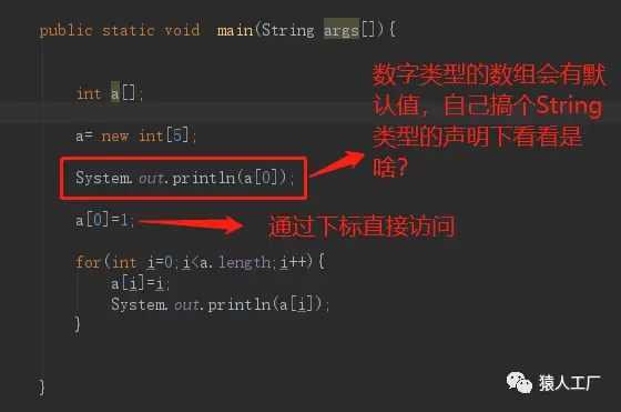 下标:数组中的每一个元素都有一个编号,也叫下标,我们访问数组内的数据,就是通过下标来访问的,每一个数组的下标都是从0开始的。