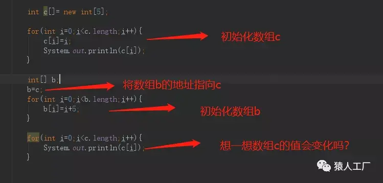 我们重新申明了一个数组c,将数组b指向数组a,然后改变数组b中元素的值,最后数组c中的元素会改变吗?