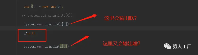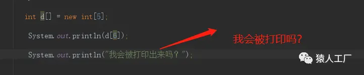 这就是空指针异常!因为数组b的引用指向了null,数组并没有元素可以访问,但是程序访问了数组b的第一个元素,程序异常退出了,所以我们在使用数组的时候一定要注意,搞出空指针。