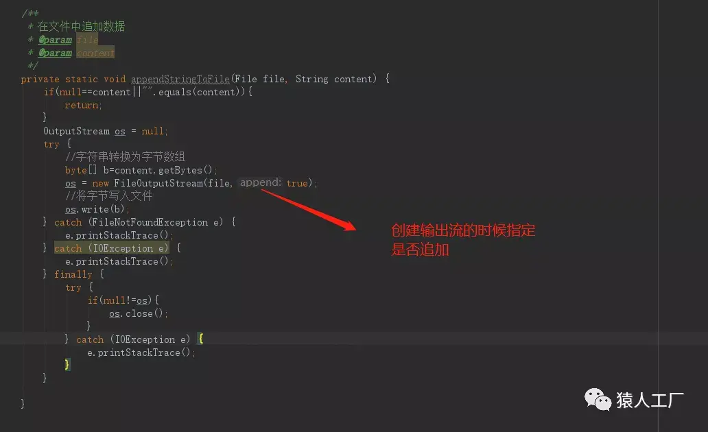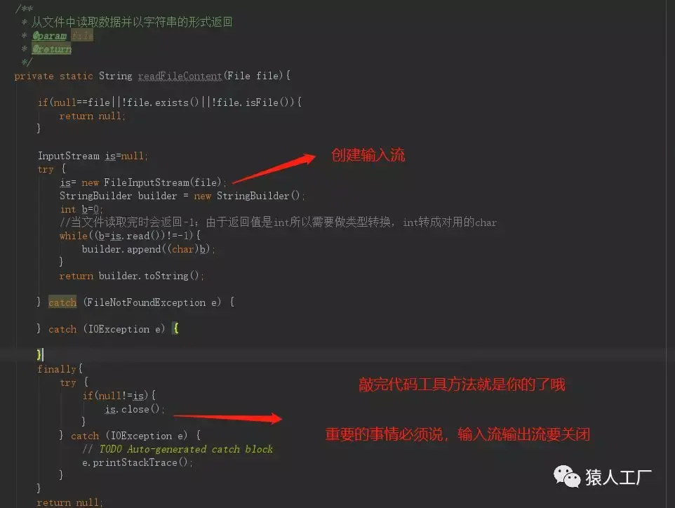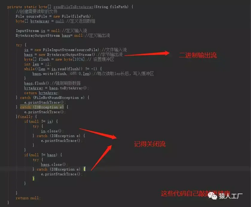 /** *使用使用字符缓冲Reader读取文件 * @param file * @return */private static String readFileBufferedReader(File file){ BufferedReader bReader=null; try { bReader=new BufferedReader(new FileReader(file)); int len; char[] ch = new char[1024]; StringBuilder builder=new StringBuilder(); while((len=bReader.read(ch))!=-1){ String str = new String(ch); builder.append(str); } return builder.toString(); } catch (FileNotFoundException e) { e.printStackTrace(); } catch (IOException e) { e.printStackTrace(); }finally{ try { if(null!=bReader){ bReader.close(); } } catch (IOException e) { e.printStackTrace(); } } return null;}/** *使用缓冲流写入文件 * @param file * @param content */private static void writeFileBuffered(File file,String content){ BufferedOutputStream bos=null; try { bos=new BufferedOutputStream(new FileOutputStream(file)); byte[] b = content.getBytes(); bos.write(b); } catch (FileNotFoundException e) { e.printStackTrace(); } catch (IOException e) { e.printStackTrace(); }finally{ try { if(null!=bos){ bos.flush(); bos.close(); } } catch (IOException e) { e.printStackTrace(); } }}字符缓冲流还有个特殊的方法——可以读取和写入一行字符串