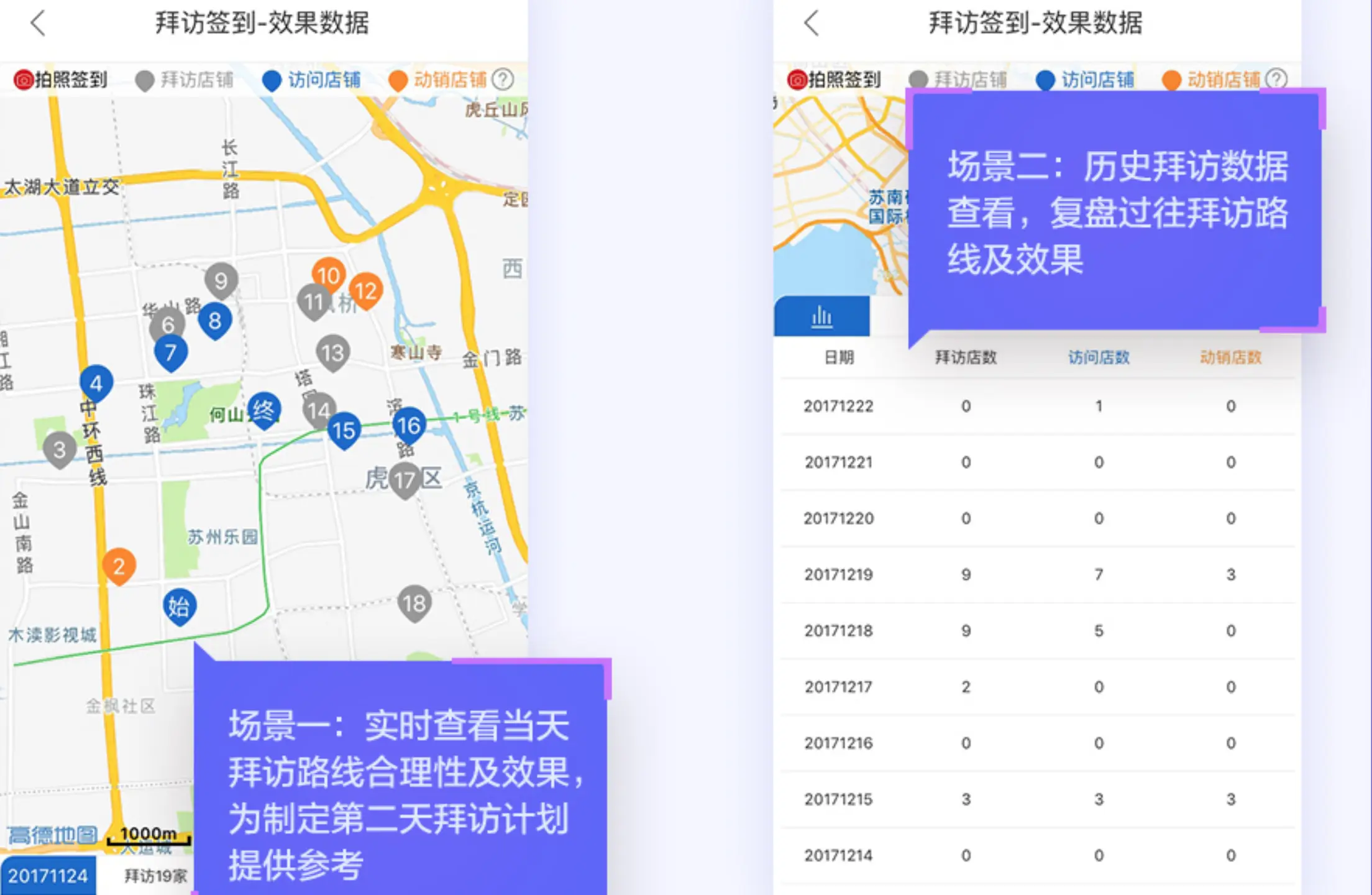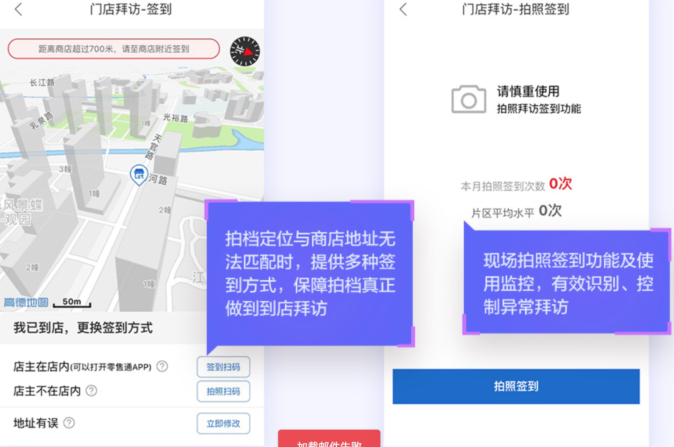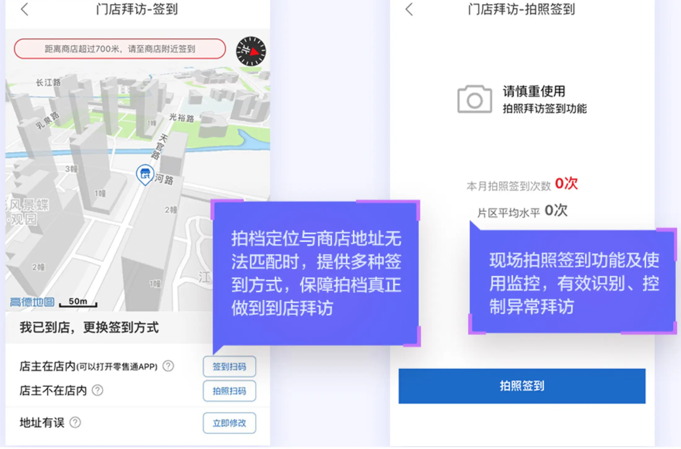 所以通过地图可视化的方式,我们可以提示拍档当前位置和小店位置其实是有一段距离的,可以让其真实到店或者选择其他的拜访方式,这样就可以提高拜访的真实性。(功能上线后,前线的反馈也的确如我们预料的))