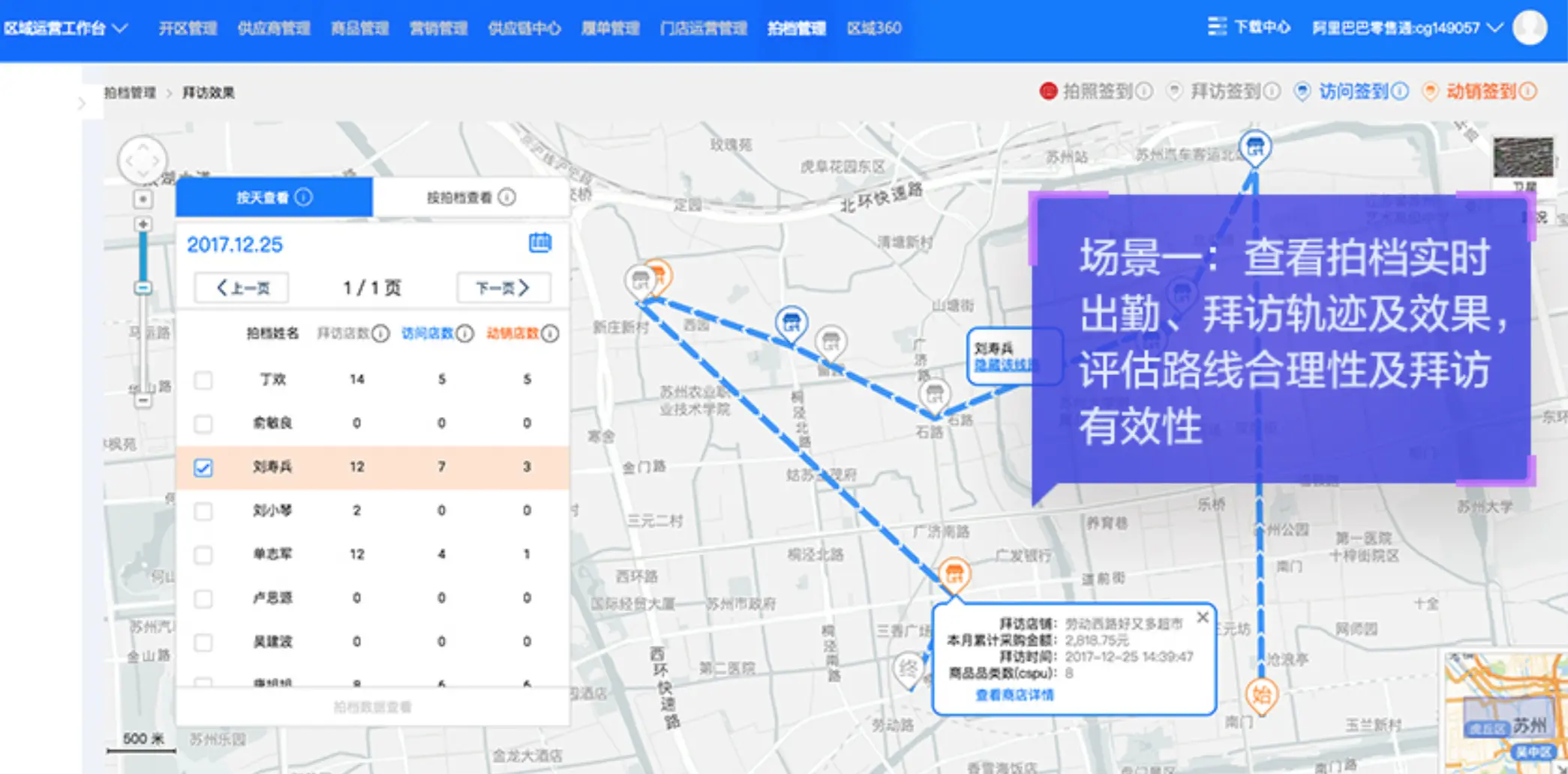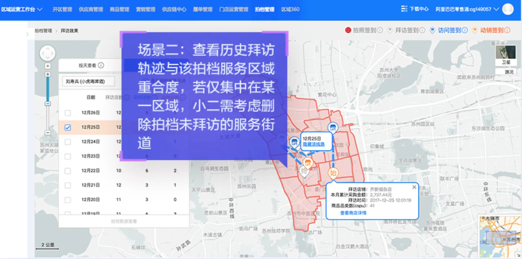 结合地图数据可视化,我们可以提供给拍档查询历史拜访路线的视图,图中的数字表示当天拍档拜访小店的顺序。