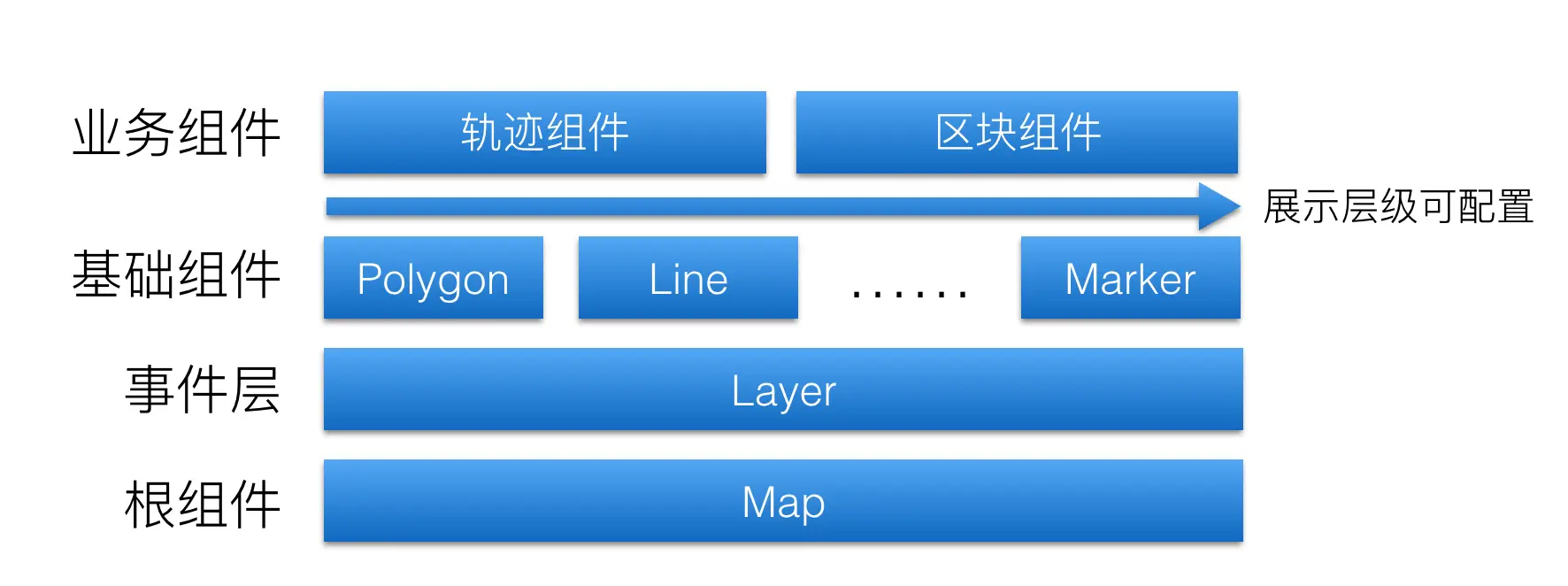 所有地图上的基础组件、事件层和业务组件等子元素都需要被包含在Map(根组件)中,其中基础组件包括块(Polygon)、线(Line)和点标记(Marker)等。