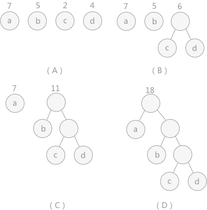 对于给定的有各自权值的 n 个结点,构建哈夫曼树有一个行之有效的办法: