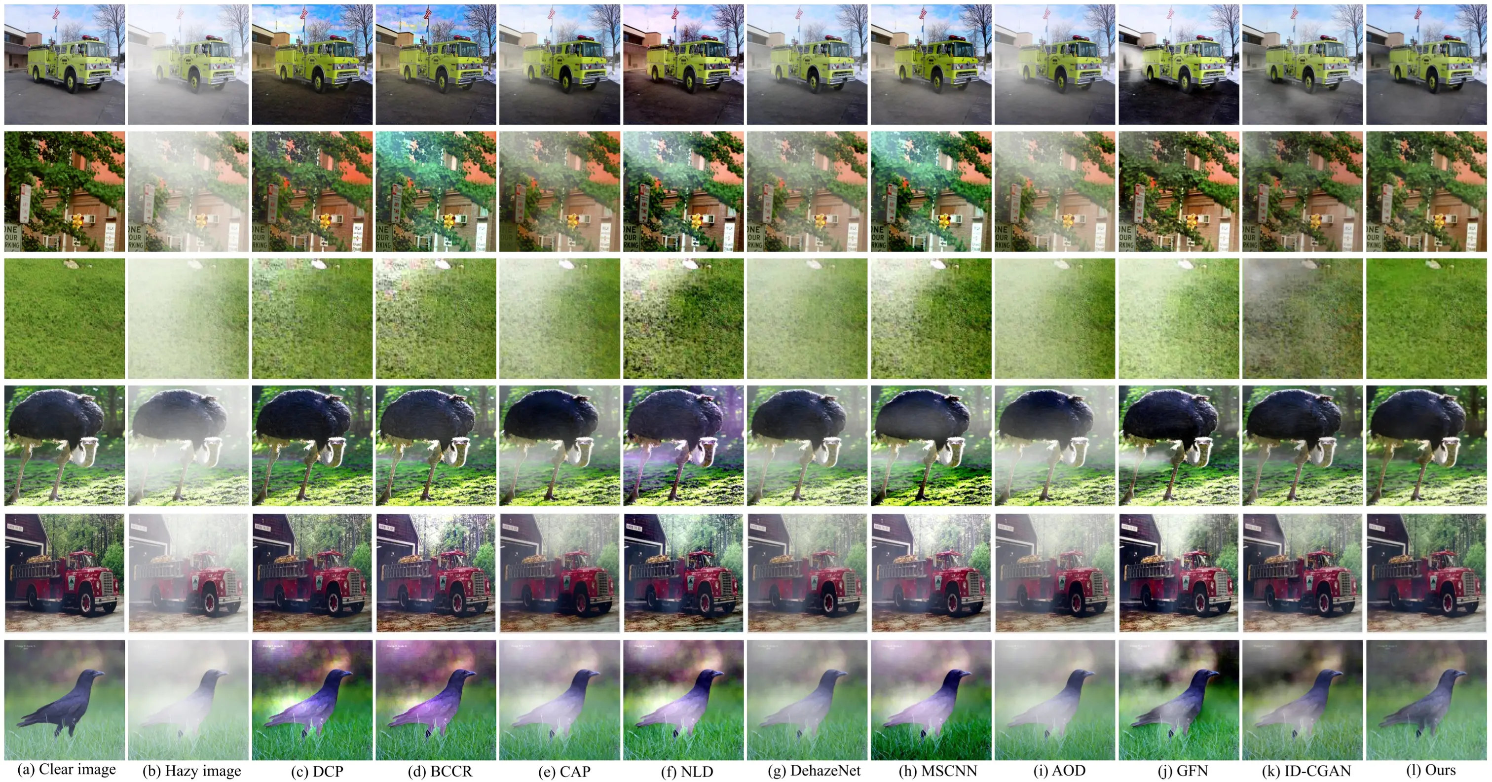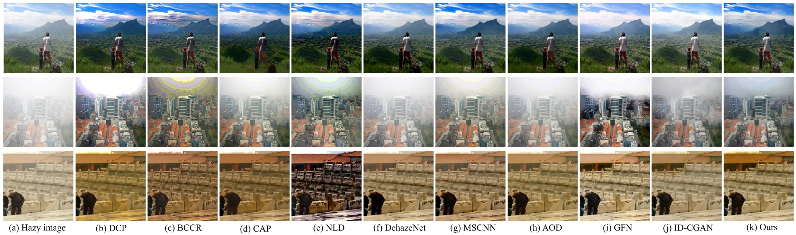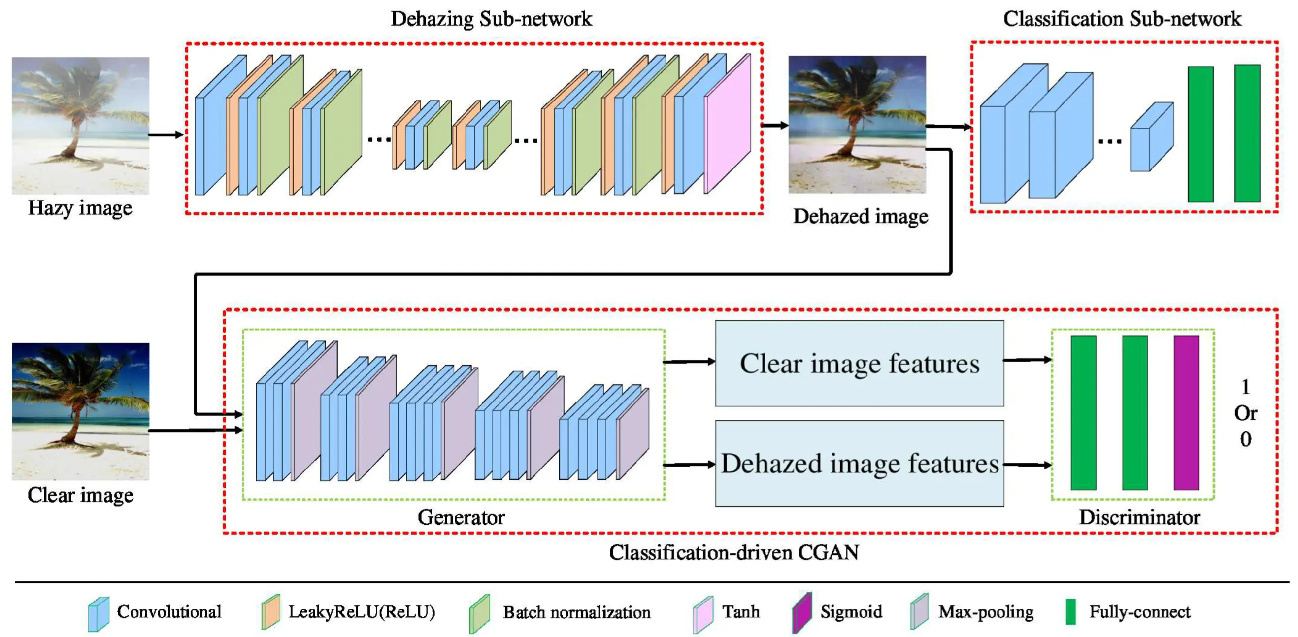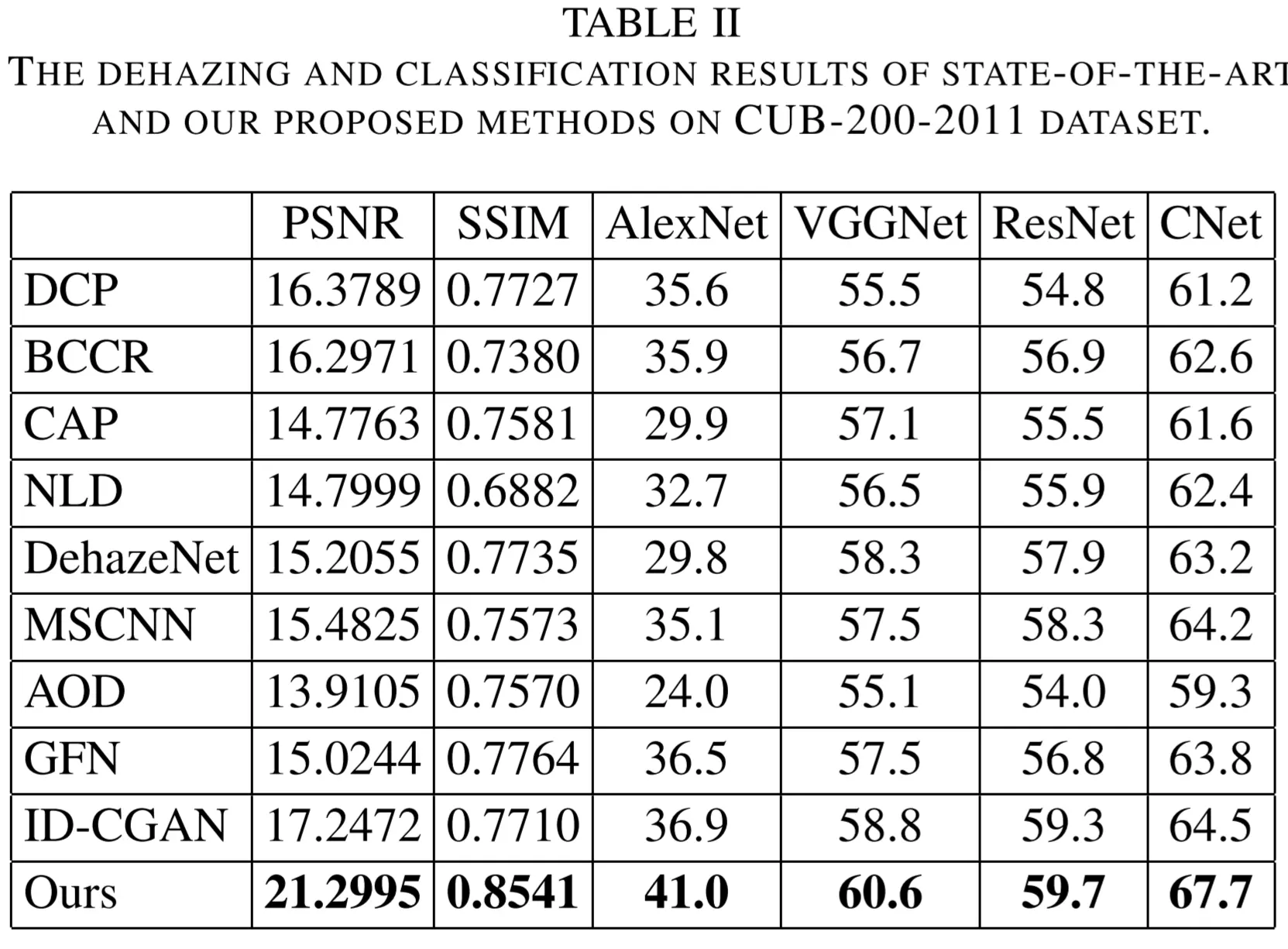 过去的loss大多数都是MSE之类的损失,在视觉上具有更好的吸引力,而对于高级视觉任务则并非总是有更好的性能。文章对此提出了一个CNN网络,包括三个部分:去雾子网(DNet)、分类驱动的对抗生成子网(CCGAN)、与图像分类相关的分类子网(CNet)。这个设计使去雾结果在视觉上和图像分类方面都具有更好的表现。
