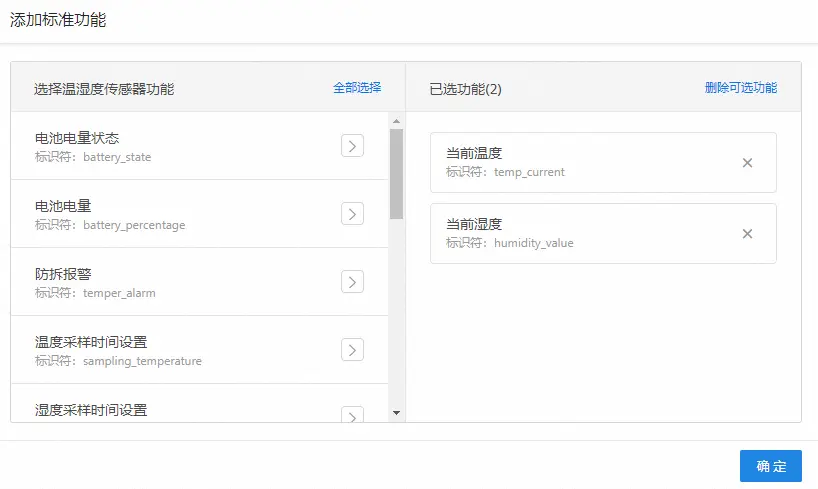 功能根据自身需求选择,这里基本功能DP建议选择门磁、告警、电量。