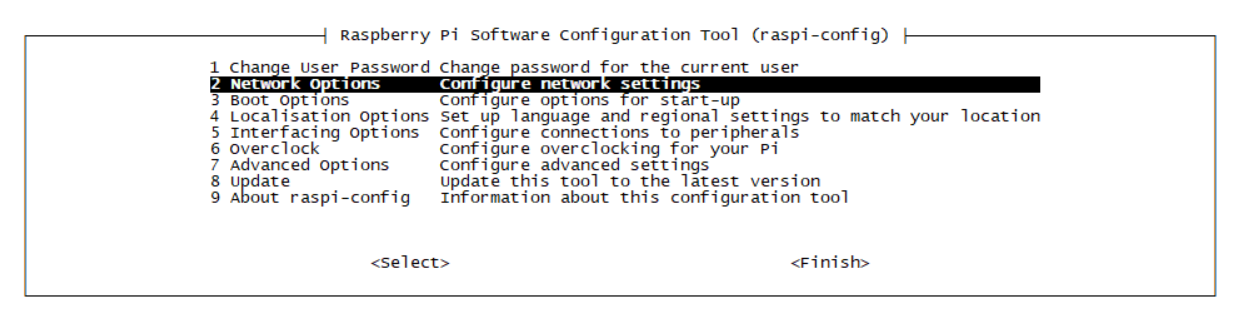 使用命令:sudo raspi-config进行树莓派配置,进入如下界面,选择 2. Network Options。