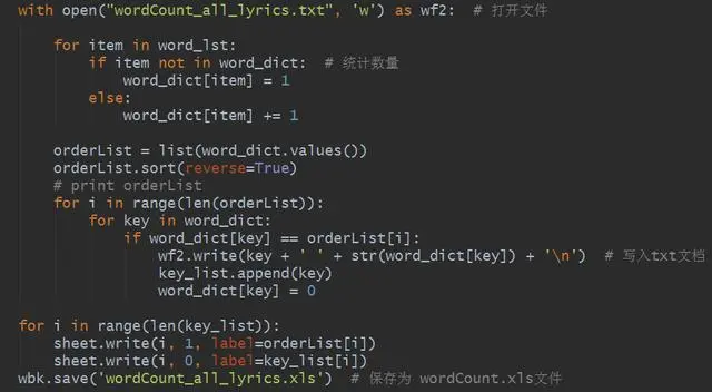 首先运用jieba库进行分词和词频统计分析,得到歌词中的词频统计,部分主要代码如下图所示:
