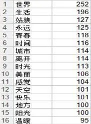 可以很明显的看出,北京直接开挂,完胜其他城市。在南方城市中,民谣歌手念叨最多的还是成都,和我在成都的街头走一走,喔喔喔~当然,南京、上海、昆明也有提及,但是分量不大。