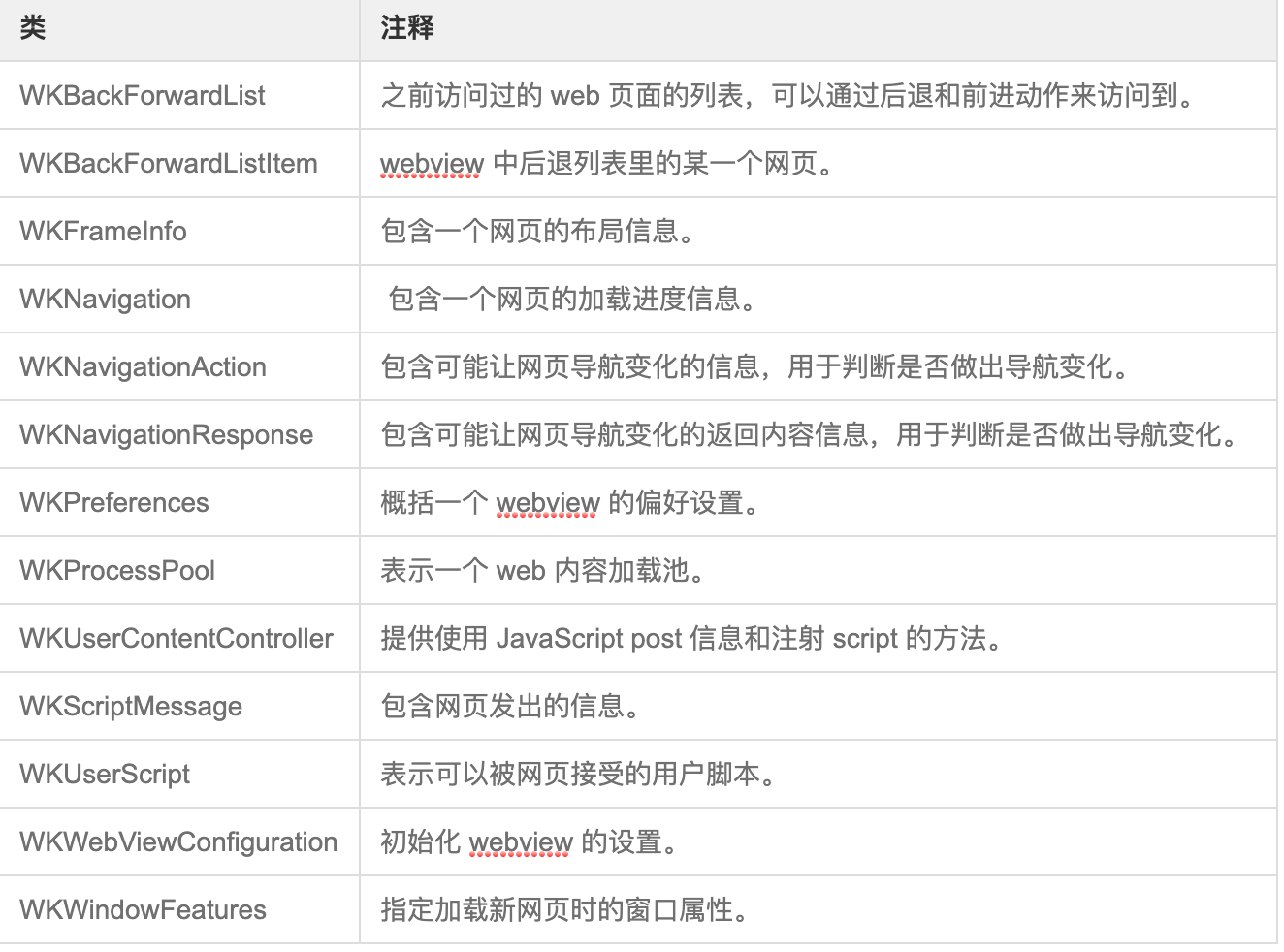 WKWebView 更快(占用内存可能只有 UIWebView 的1/3~1/4),没有缓存,更为细致地拆分了 UIWebViewDelegate 中的方法。 想要了解更多关于 WKWebView 的特性的,可以自行 Google,这里你可以简单地把它当做是轻量级的 UIWebView。 常用代理方法在 WKWebView 中,UIWebViewDelegate 与 UIWebView 被重构成了14类与3个协议,下面给出一些在 UIWebView 中常用的方法的 WKWebView 版本。