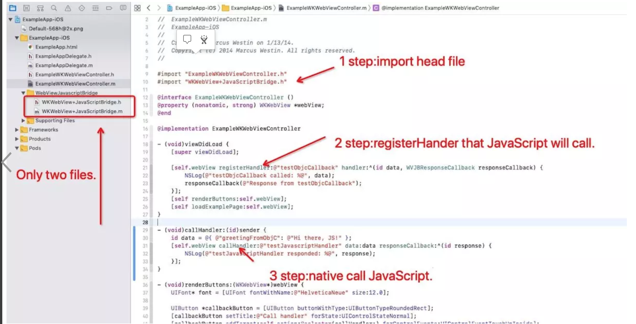 原理:双向注册方法,双向接收方法,OC可以调用js,js可以调用OC。