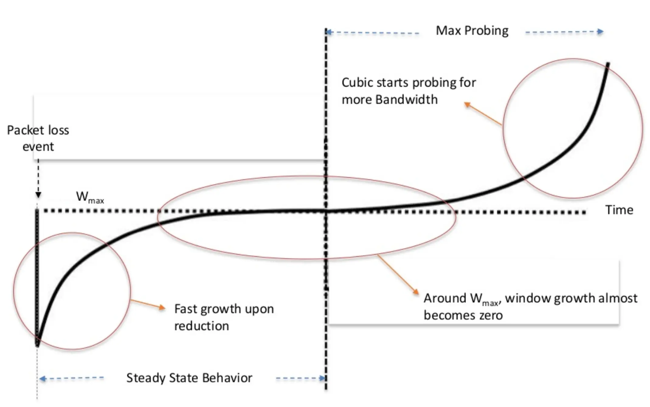 平滑后的 CWND 和时间组成的曲线如下,可以看到三次曲线保留了 BIC 的优点,即在丢包后初期,CWND 能快速增长,减小丢包带来的影响;并且在接近上一个 CWND 最大值时 CWND 增长速度又会非常慢,要经历很长时间才能超越 Wmax,从而能尽力保持稳定,稳定在 Wmax 上;最后在超越 Wmax 后初期也是增长的非常慢,直到后来才快速的指数形式增长,用于探测下一个 Wmax。