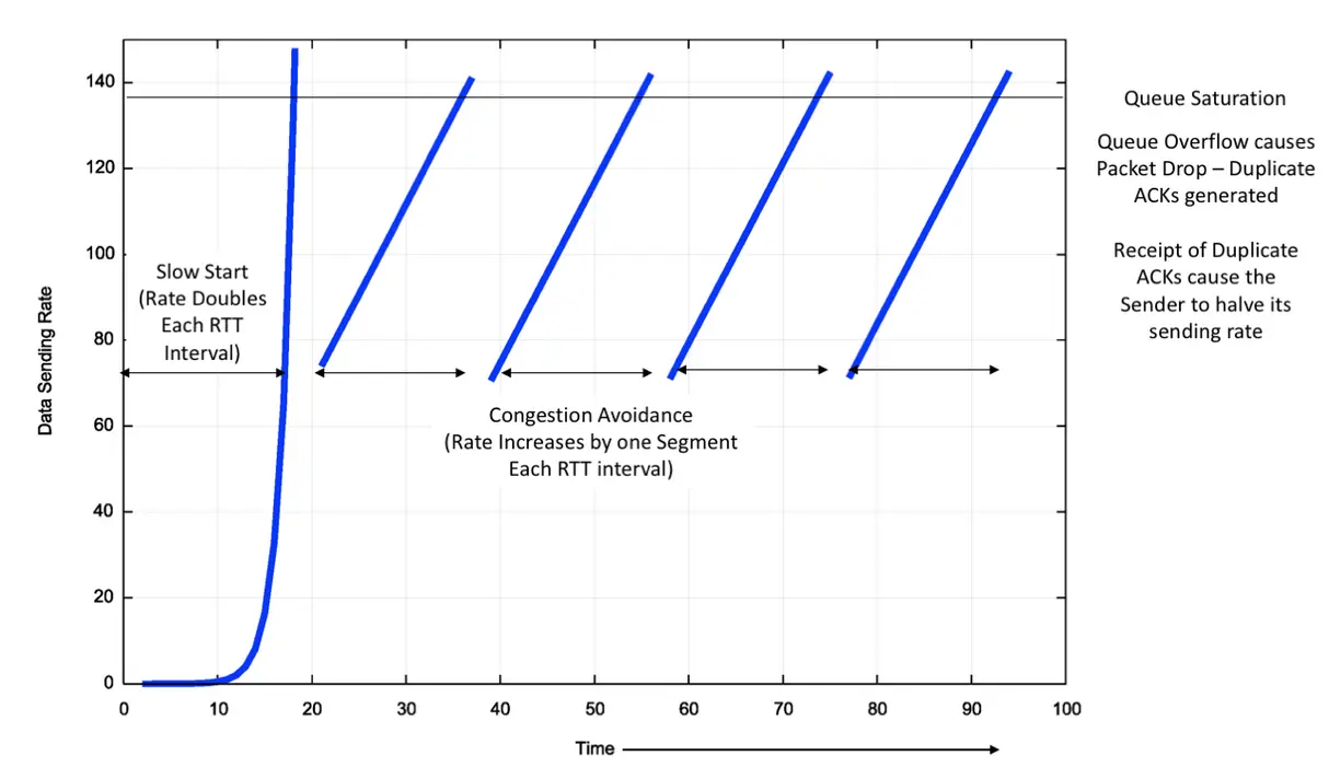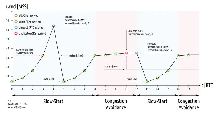 TCP 连接建立后先经过 Slow Start 阶段,每收到一个 ACK,CWND 翻倍,数据发送率以指数形式增长,等出现丢包,或达到 ssthresh,或到达接收方 RWND 限制后进入 Congestion Avoidance 阶段。下面这个图挺好的,描述了好几个过程,找不到出处了,只是列一下图吧。