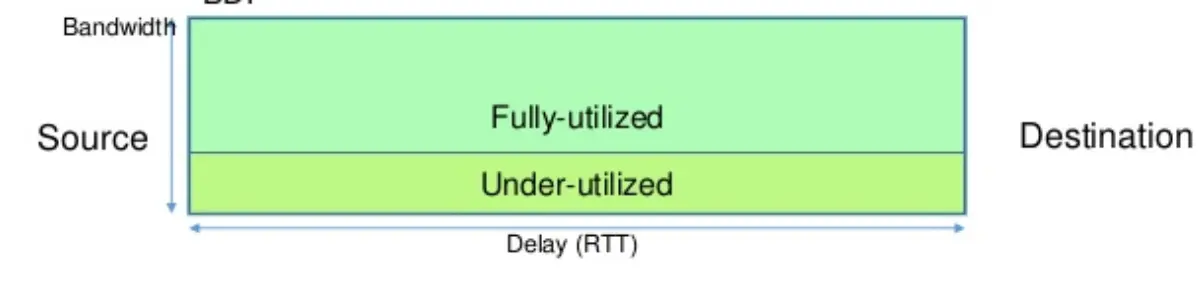 BDP 是 Bandwidth and Delay Product. 就是带宽 (单位 bps) 和延迟 (单位 s) 的乘积,单位是 bit,也是 Source 和 Destination 之间允许处在 Flying 状态的最大数据量。Flying 也叫 Inflights,就是发送了但还未收到的 Ack 的数据。