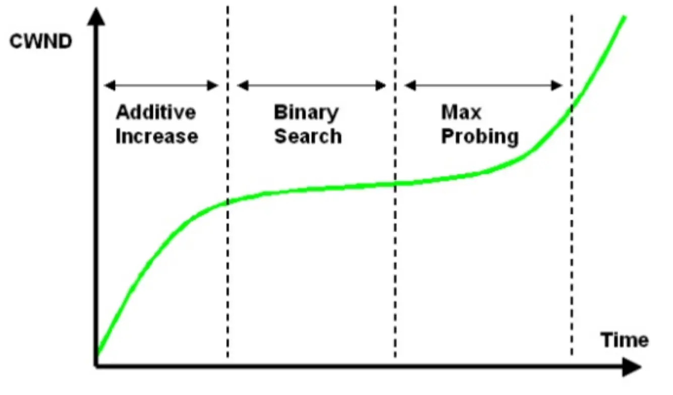 BIC 叫 Binary Increase Congestion Control,是在 Reno 基础上做改进,将 CWND 扩大过程分成三个阶段,第一阶段是在遇到丢包后将 CWND 降为 β × Wmax,(一般 β 是 0.5,Wmax 是丢包时 CWND)但记住之前 Wmax 最大值,之后以一个较快速度增加 CWND,在接近 Wmax 后 CWND 增加量是一个 Wmax 和 CWND 之间的二次函数,称为 Binary Increase,逐步去接近 Wmax,到达 Wmax 后又转换为二次曲线去探测下一个极限。具体内容可以看 Wiki,在这里:BIC TCP - Wikipedia
