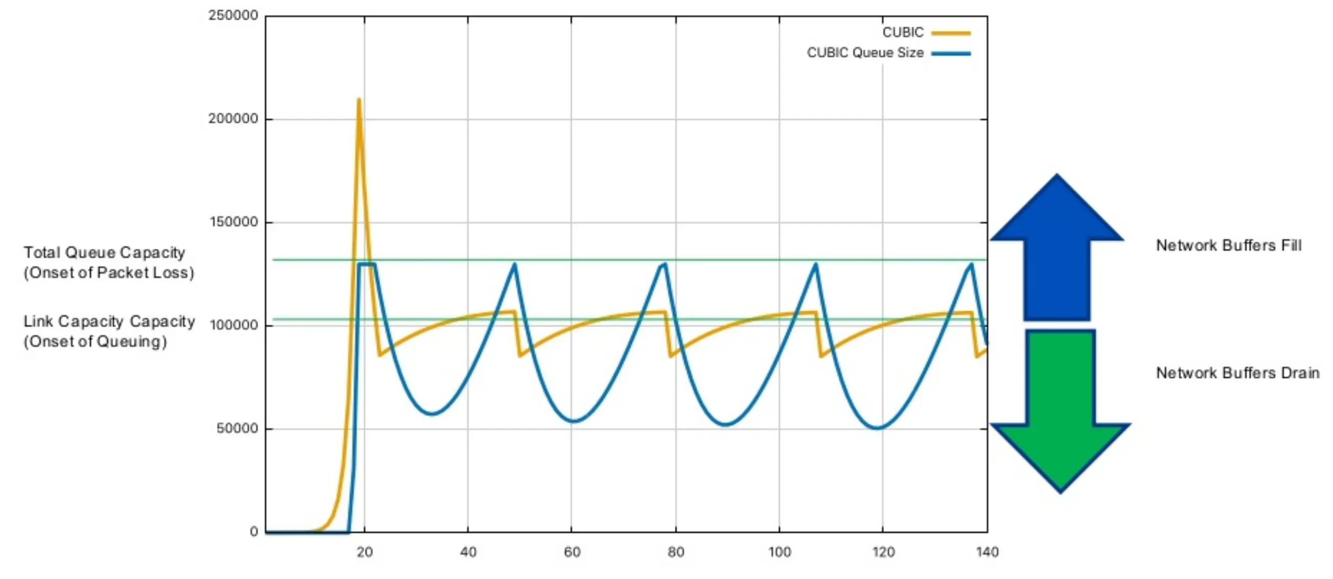 从上面假设能看出,Reno 下受链路上 Buffer 大小影响很大。当 Buffer 较小的时候,链路上实际处在发送状态的数据量还未达到 BDP (Bandwidth delay product) 时候可能就会出现丢包,导致 Reno 立刻减半发送速率,从而无法高效的利用网络带宽。如果 Buffer 很大,超过 BDP,可能会进入 “Buffer Bloat” 状态,即延迟畸高,因为即使 Reno 速度降为一半依然不能保证使链路 Buffer 清空,或者说可能大部分时间链路上 Buffer 都处在非空状态,且每次 Reno 因为丢包而降速时,会做数据重传,导致之前发送的可能还依旧在链路上排队的数据空占资源没起到作用最终白白丢掉,于是让整条链路上持续存在固有延迟。