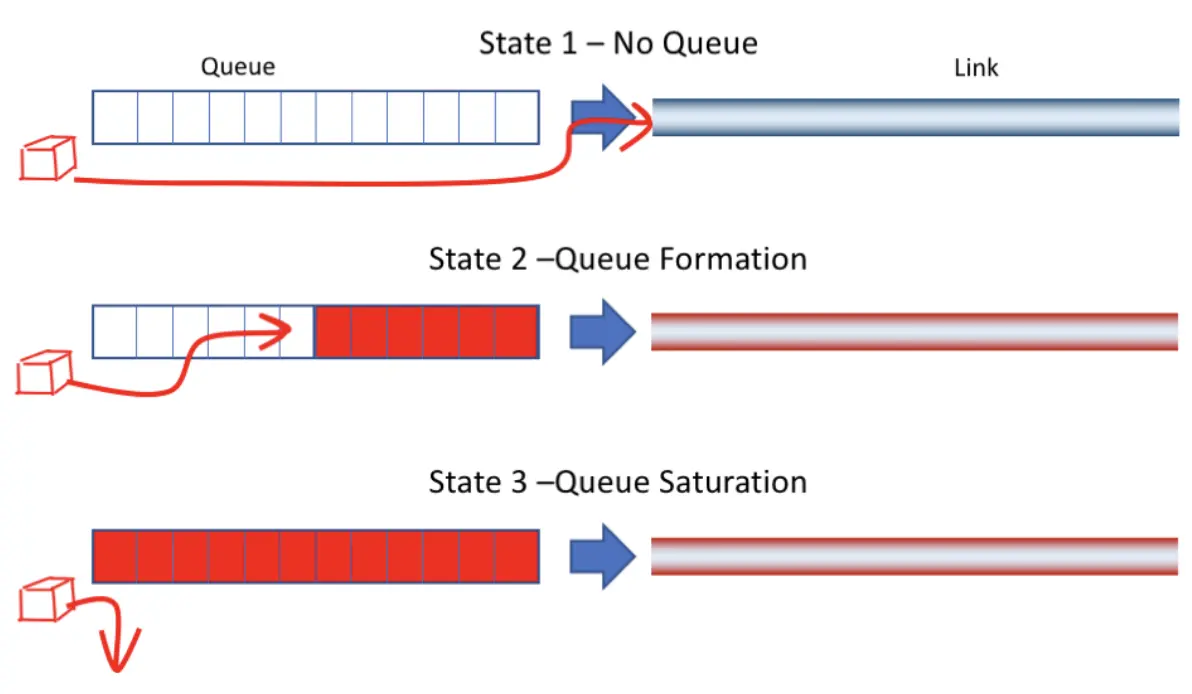 - 当队列满的时候进入第三个状态,队列满了出现丢包;