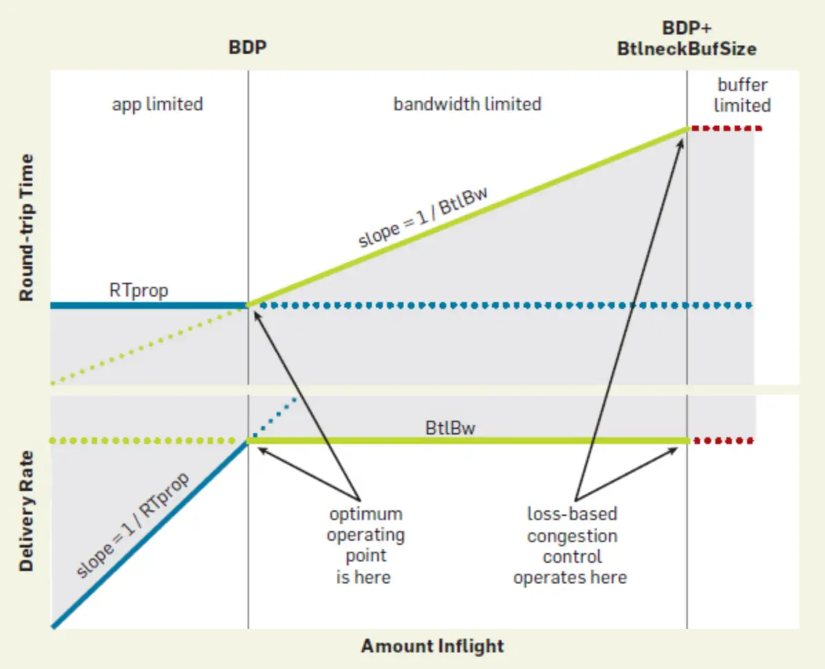 下半部分,Inflights 比较小,随着 Inflights 增大 Delivery Rate 越大,因为此时还未达到带宽上限,发的数据越多到达率也就越高。等 Inflights 超过 BDP 后,Delivery Rate 受制于 BtlBw 大小不会继续增大,到达速度达到上限,Buffer 开始积累。当 Buffer 达到最大限度后,进入红色区域开始丢包。
