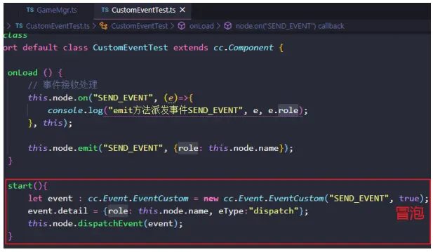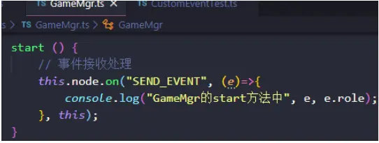 注意:此时,如果我们要在其父节点Canvas节点下也能接收到此SEND_EVENT事件,我们会设想,在GameMgr.ts中增加如下代码,但是事实上,运行后,GameMgr.ts的如下代码没有接收到派发事件。