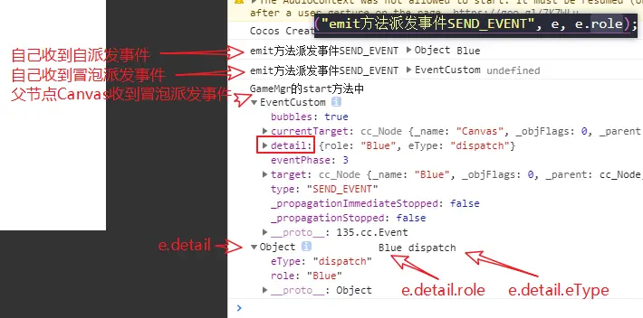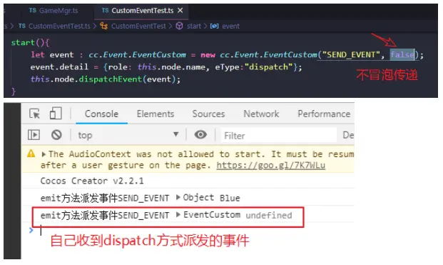 注意:若将CustomEventTest.ts中的事件冒泡属性改为false,如下,表示不冒泡传递,则其父节点Canvas将收不到派发的事件。
