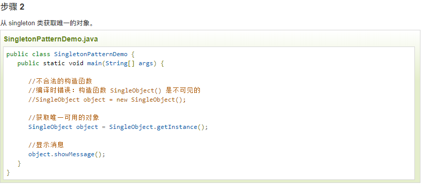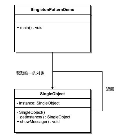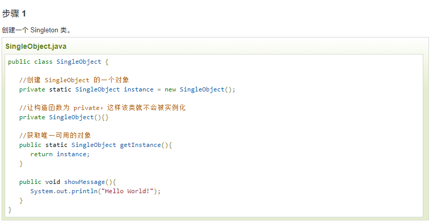 SingleObject 类提供了一个静态方法,供外界获取它的静态实例。SingletonPatternDemo,我们的演示类使用 SingleObject 类来获取 SingleObject 对象。