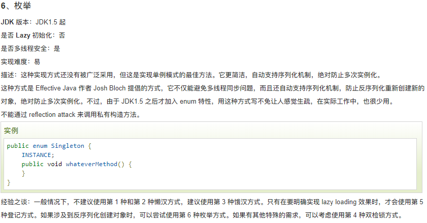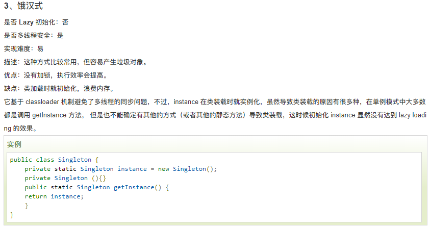 1、在内存里只有一个实例,减少了内存的开销,尤其是频繁的创建和销毁实例(比如管理学院首页页面缓存)。 2、避免对资源的多重占用(比如写文件操作)。 缺点:没有接口,不能继承,与单一职责原则冲突,一个类应该只关心内部逻辑,而不关心外面怎么样来实例化。