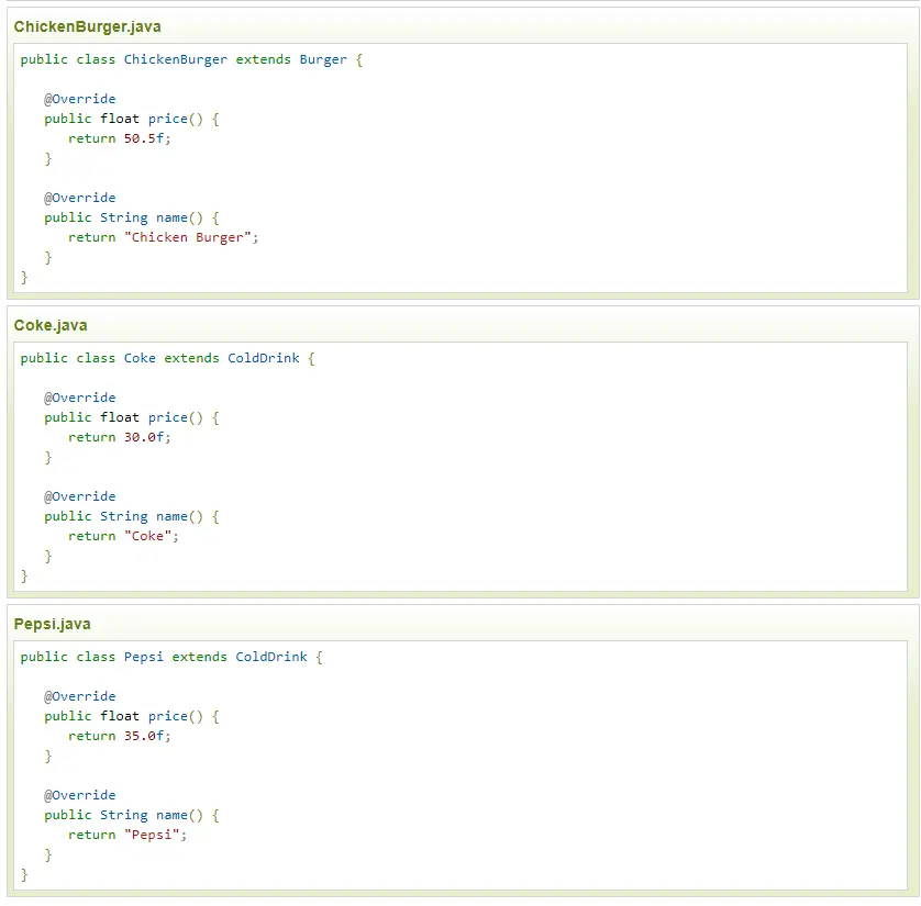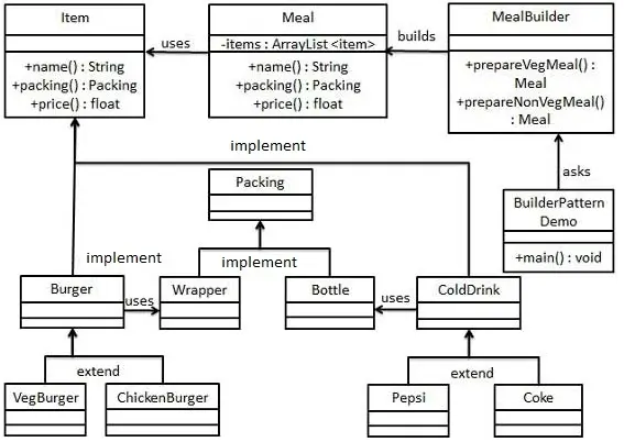 我们假设一个快餐店的商业案例,其中,一个典型的套餐可以是一个汉堡(Burger)和一杯冷饮(Cold drink)。汉堡(Burger)可以是素食汉堡(Veg Burger)或鸡肉汉堡(Chicken Burger),它们是包在纸盒中。冷饮(Cold drink)可以是可口可乐(coke)或百事可乐(pepsi),它们是装在瓶子中。
