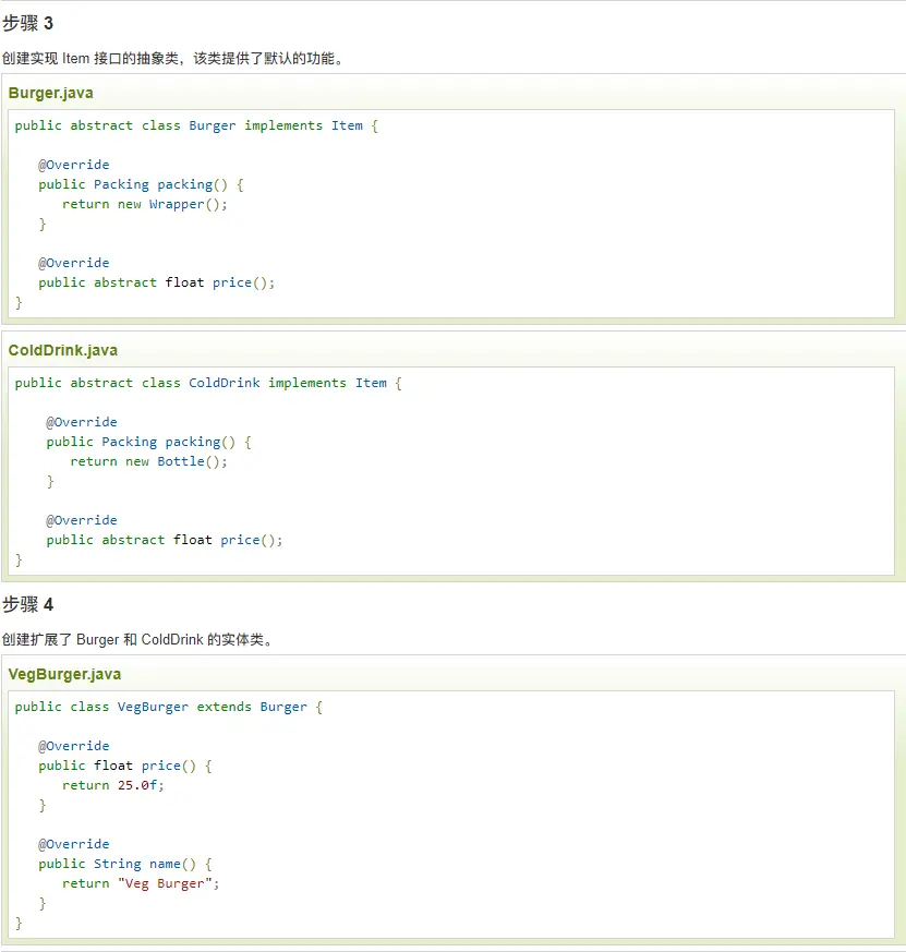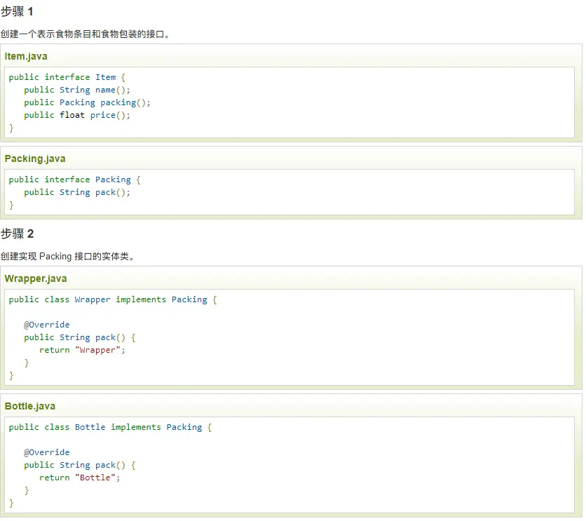 我们将创建一个表示食物条目(比如汉堡和冷饮)的 Item 接口和实现 Item 接口的实体类,以及一个表示食物包装的 Packing 接口和实现 Packing 接口的实体类,汉堡是包在纸盒中,冷饮是装在瓶子中。