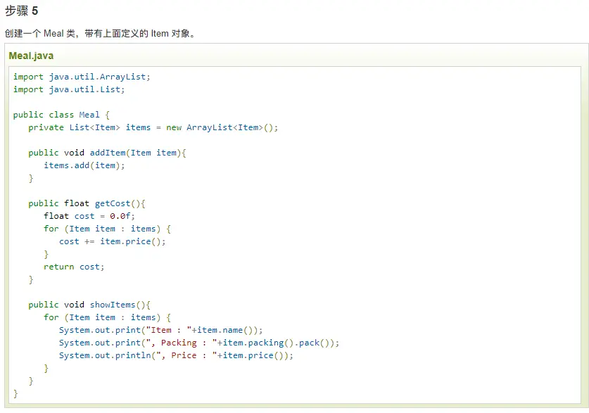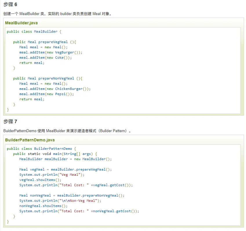 然后我们创建一个 Meal 类,带有 Item 的 ArrayList 和一个通过结合 Item 来创建不同类型的 Meal 对象的 MealBuilder。BuilderPatternDemo,我们的演示类使用 MealBuilder 来创建一个 Meal。