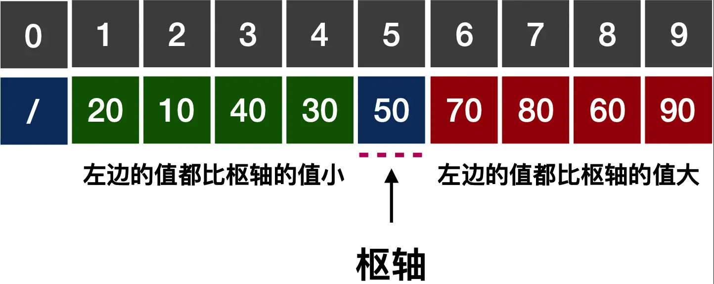 //选取当中一个关键字作为枢轴; 将它放在⼀一个合适的位置上,使得它的左边的值都它小,右边的值都比它大;这时枢轴的位置就是最终排序后枢轴的位置