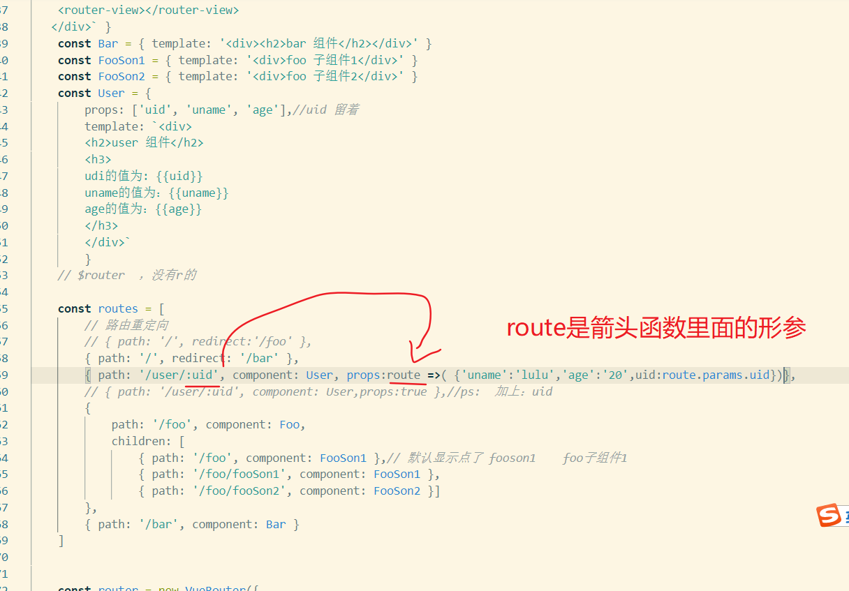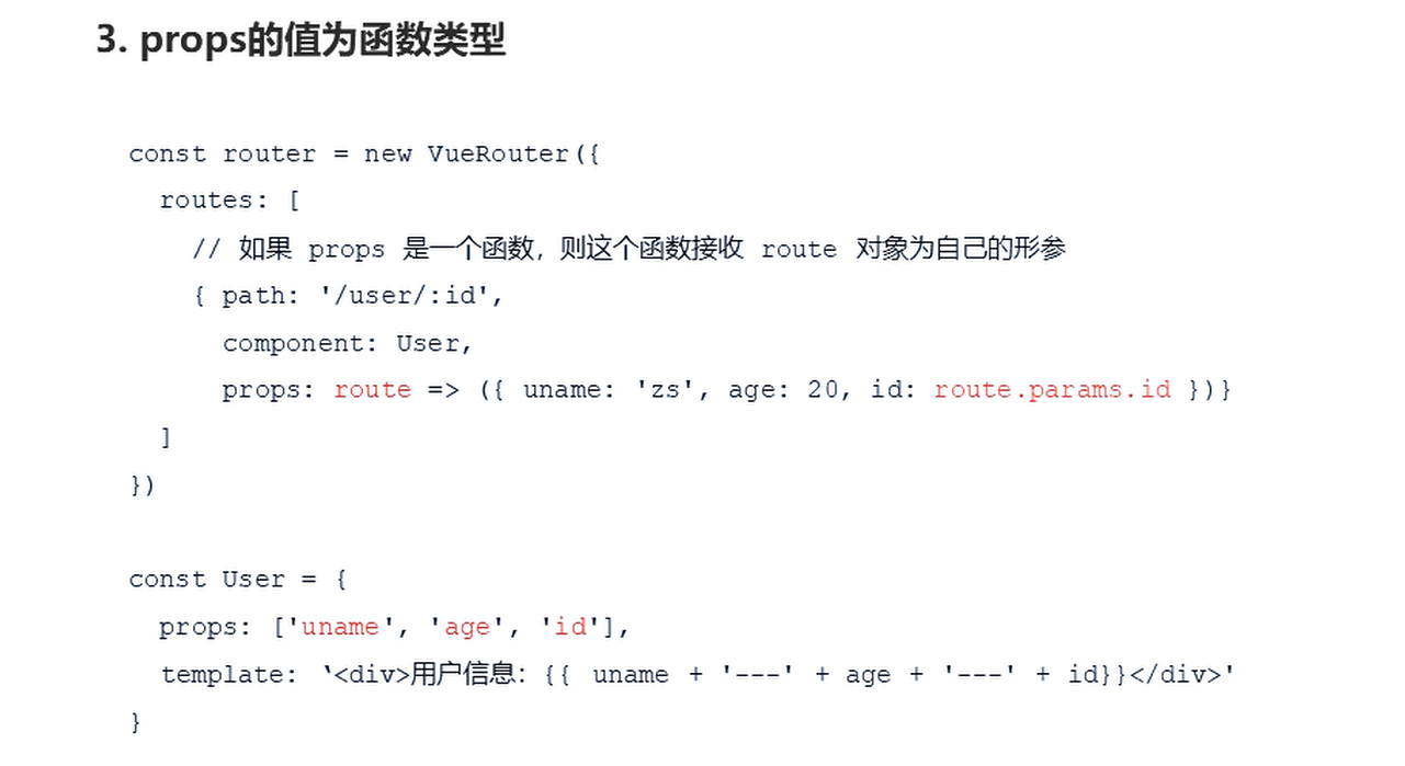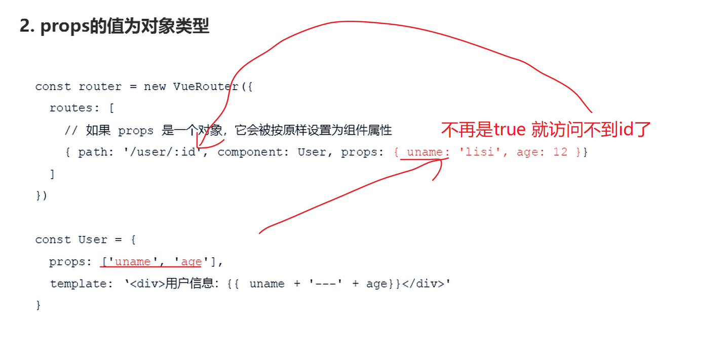 { name: 'user3', path: '/user/:uid', component: User, props: route => ({ 'uname': 'lulu', 'age': '20', uid: route.params.uid }) },
