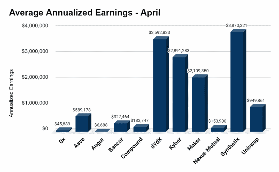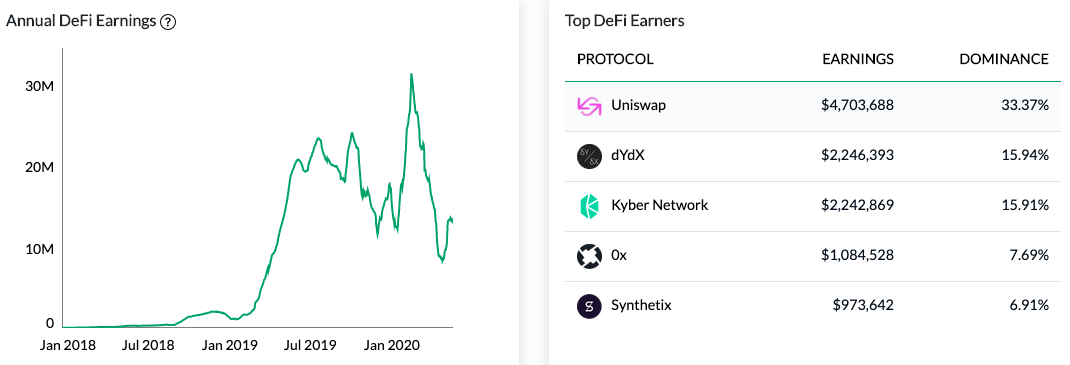 Dex 方面 Uniswap 也是 DeFi 收益主力军,截至 4 月份,支付给做市商的交易费大约为 100 万美元,但年初至今,该协议的预期收益仍增长了 110%
