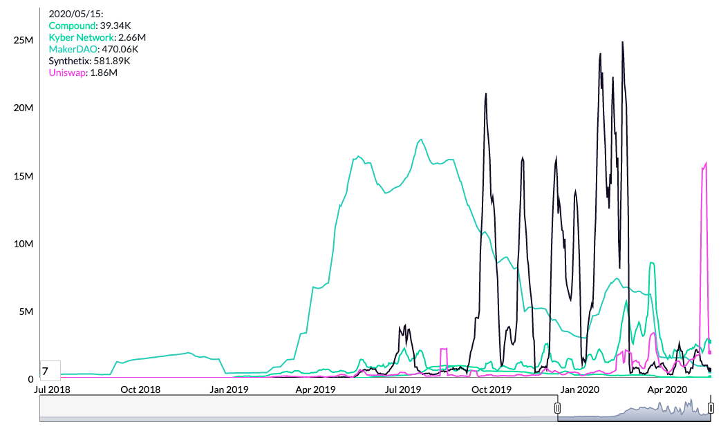 更聚焦的看,对比 Compound 、Kyber、Maker 、Synthetix、Uniswap 市场上收益: