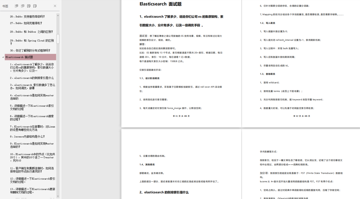 1、elasticsearch 了解多少,说说你们公司 es 的集群架构,索引数据 大小,分片有多少,以及一些调优手段 。 2、elasticsearch 的倒排索引是什么 3、elasticsearch 索引数据多了怎么办,如何调优,部署 4、elasticsearch 是如何实现 master 选举的 5、详细描述一下 Elasticsearch 索引文档的过程 6、详细描述一下 Elasticsearch 搜索的过程? 7、Elasticsearch 在部署时,对 Linux 的设置有哪些优化方法