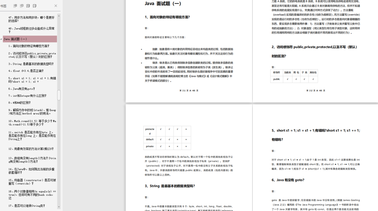 1、面向对象的特征有哪些方面?......................................................... 211 2、访问修饰符 public,private,protected,以及不写(默认)时的区别? ....................................................................................................................212 3、String 是最基本的数据类型吗?....................................................213 4、float f=3.4;是否正确?.................................................................... 213 5、short s1 = 1; s1 = s1 + 1;有错吗?short s1 = 1; s1 += 1;有错吗? ....................................................................................................................214 6、Java 有没有 goto?..........................................................................214 7、int 和 Integer 有什么区别?........................................................... 214
