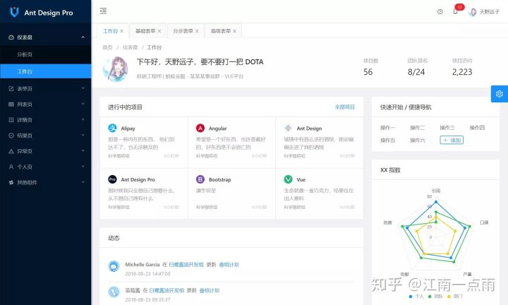 - ant design 本身发展时间挺久了,但是一直都是跟 React 玩,去年才开始支持 Vue,这也是这个 Ant Design Pro 看起来比较简单的原因。