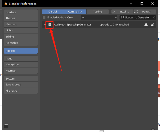3. 将下载好的代码( add_mesh_SpaceshipGenerator.zip, 以压缩包的形式)载入到blender中: