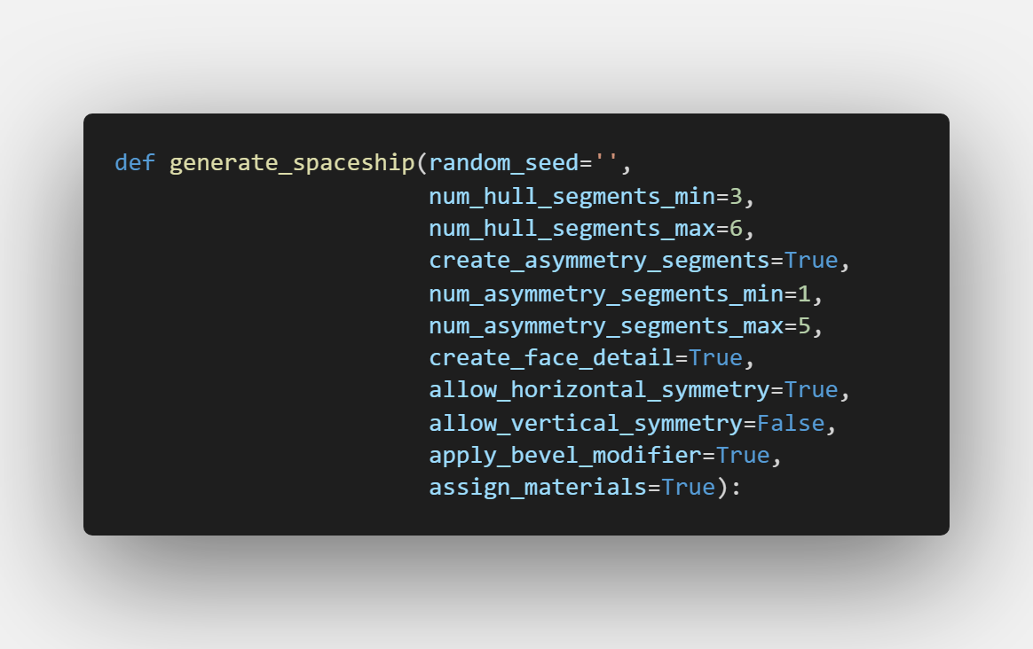 如果你想自己再进行一下DIY,让飞船变得更丑帅气,那也是可以的!把下载下来的压缩包解压,里面会有一个文件叫spaceship_generator.py的,这个就是主要的模型生成代码。你能在里面看到作者的许多参数设置,稍微修改一下会有惊喜哦!