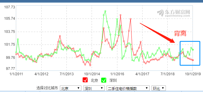 wow,看来深圳的二手房价还真是与众不同,不过从下面这个图看,确实,深圳的二手房价格和北京的二手房价格已经出现了背离的情况。