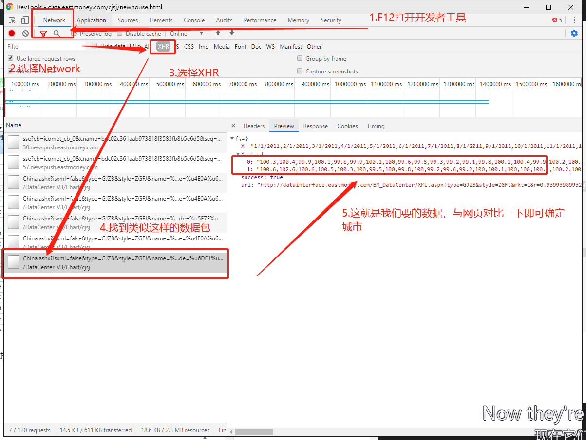 数据从2011年1月1日开始,每个数据点是当时一个月的价格指数,采集方法是用开发者工具找到请求发回来的JSON数据,方法如下: