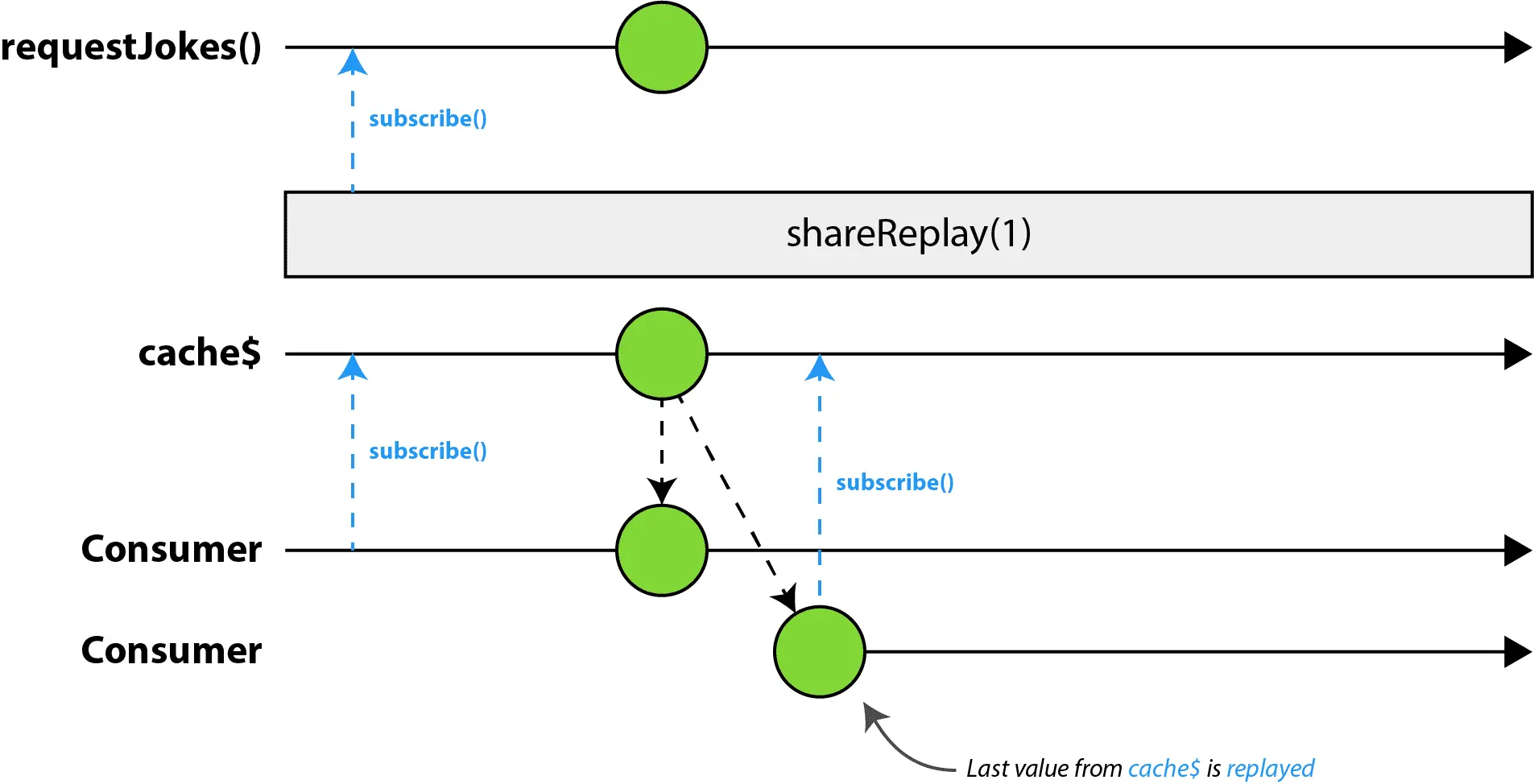 一种简单的方法是直接返回this.requestJokes(),但这并不能解决问题。我们已经知道HttpClient公开的所有方法(例如get)都返回Code Observables。这意味着将为每个订阅者重新发射整个数据流,从而导致HTTP请求的开销。毕竟,缓存是为了加快应用程序的加载时间,并将网络请求数量限制为最小。