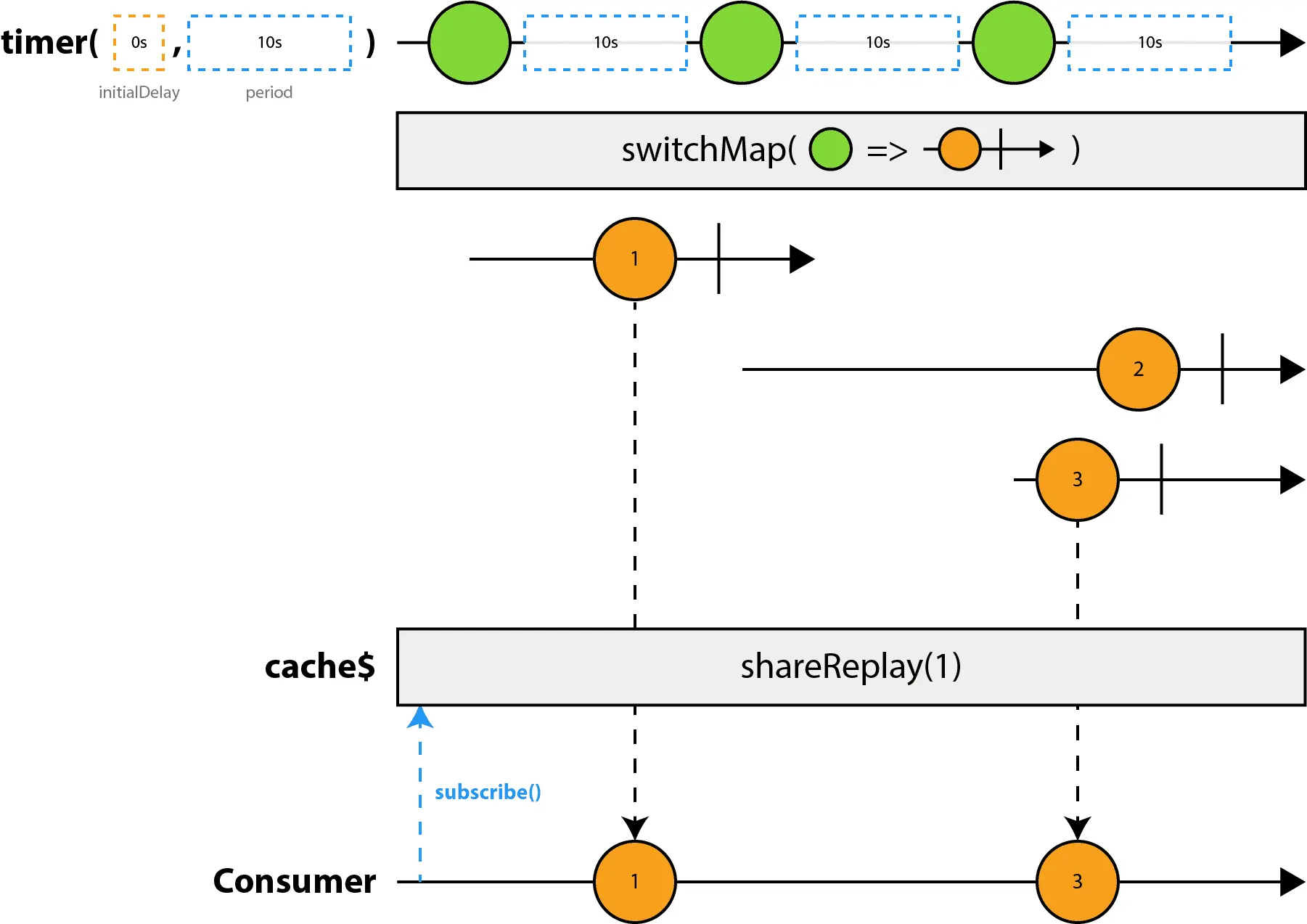 为了真正理解这一点,让我们更进一步,看一下缓存在Observable级别的工作方式。 为此,我们使用marble图来可视化观察数据流是如何工作的: