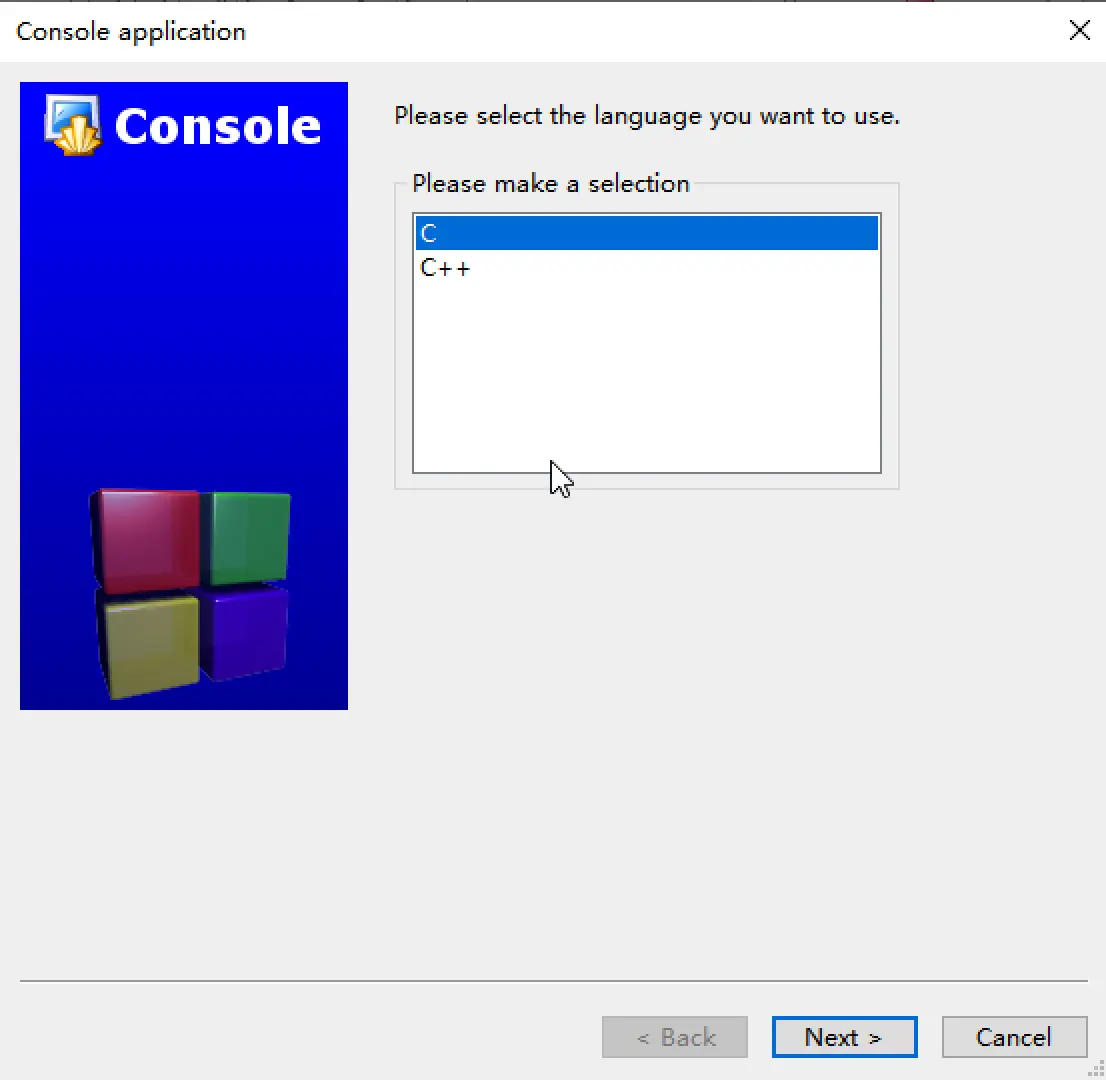 这一步是让你选择要使用的编程语言,有 C 和 C++ 两个选项,我们选择 C,表示要创建的是 C语言的项目。然后点击 Next 进入下一步: